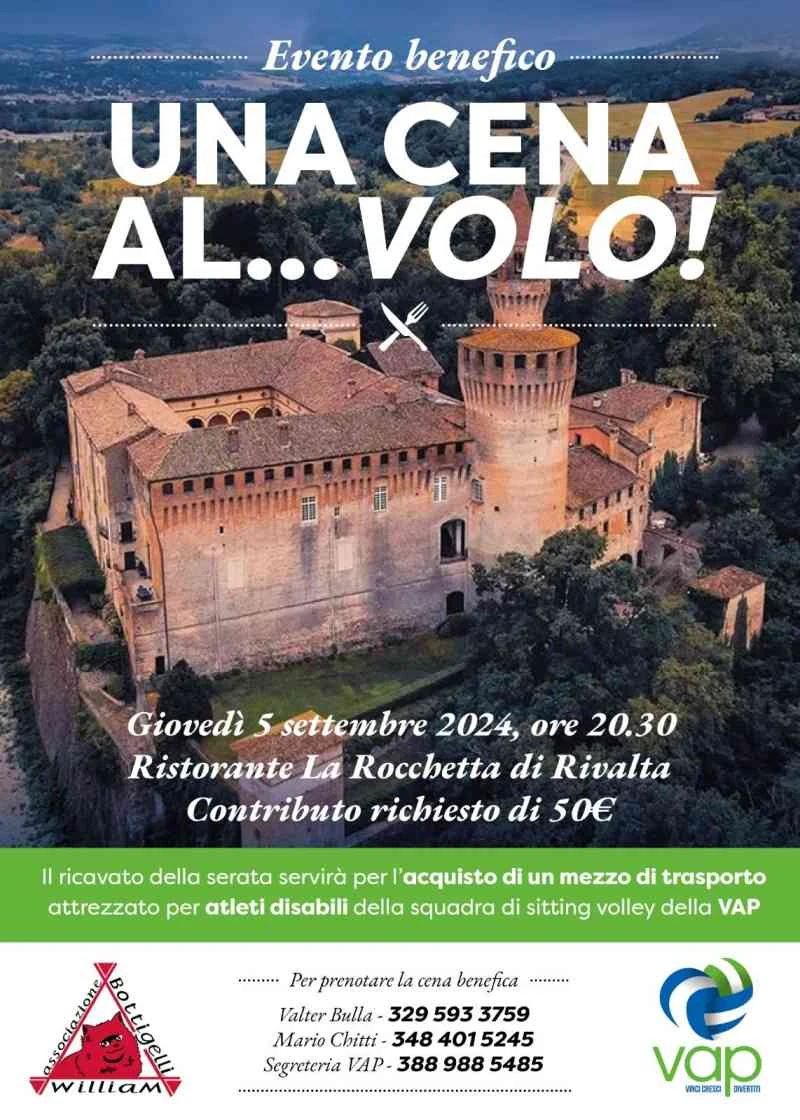 Una Cena al Volo, evento benefico il 5 settembre a Rivalta. Il ricavato servirà per l’acquisto di un mezzo di trasporto attrezzato per atleti disabili della squadra di sitting volley della VAP. L’appuntamento è in programma al ristorante La Rocchetta.