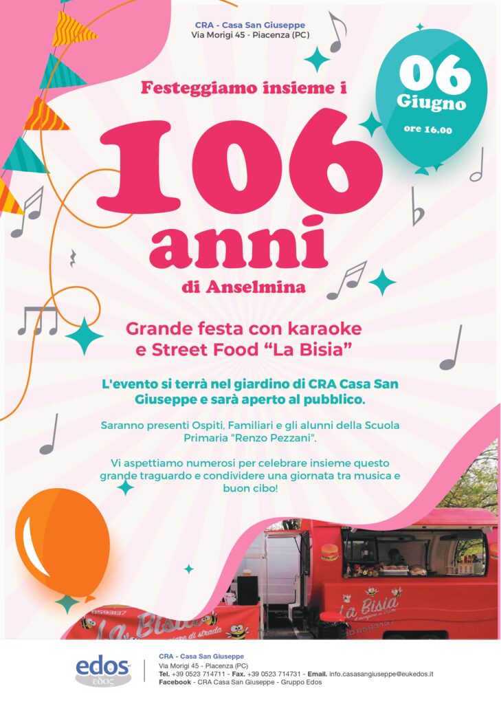 La signora Anselmina che ha festeggiato oggi un ambito traguardo 106 anni. Alla CRA Casa San Giuseppe non le hanno fatto mancare l’affetto dei suoi cari, ma soprattutto tanto amore presente il personale gli amici del quartiere e gli alunni della scuola primaria Renzo Pezzani il fast food e una torta.