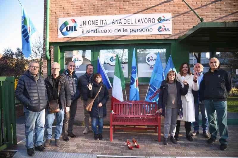Una panchina rossa inaugurata a Piacenza per la sede della Uil, in via Martiri della Resistenza 4 A. Alla presenza del segretario provinciale Francesco Bighi, alla referente provinciale Pari Opportunità Grazia Papamarenghi ed ai rappresentanti del Sindacato, anche la presidente del Consiglio comunale di Piacenza, Paola Gazzolo.