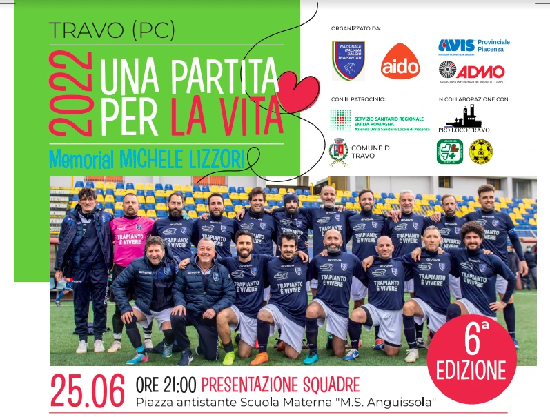 Torna anche quest’anno, per la sesta edizione, il memorial Michele Lizzori Una partita per la vita 2022, organizzato da Aido Rivergaro insieme ad Avis e Admo e dalla Nazionale italiana calcio trapiantati. L’appuntamento è per il 25 e 26 giugno a Travo. Sabato, dalle 21, nella piazza antistante la scuola materna Anguissola, è in programma la presentazione delle squadre. Si sfideranno la Nazionale italiana calcio trapiantati, la Pubblica Assistenza Valtrebbia e la FC Niviano. La serata prosegue con un incontro condotto dalla giornalista Elisa Malacalza.