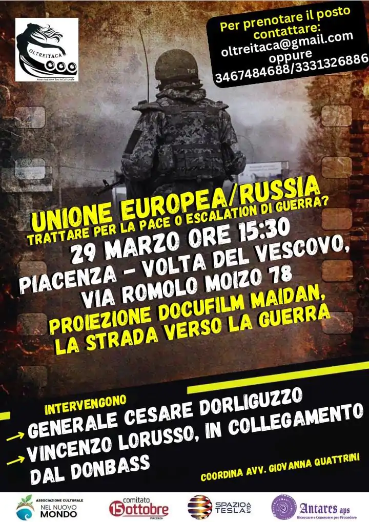 Il Generale Cesare Dorliguzzo sarà a Piacenza sabato 29 marzo 2025 su invito dell’Associazione Oltreitaca per la proiezione del docufilm “MAIDAN, LA STRADA VERSO LA GUERRA”. L’incontro pubblico si svolgerà alle ore 15.30 presso la Volta del Vescovo in via Moizo 78 a Piacenza. Cesare Dorliguzzo, generale della riserva dell’Esercito Italiano è stato impegnato negli incarichi di comando di Stato Maggiore in Italia e all’estero nei settori operativi, logistici, addestrativi e territoriali in ambito della Forza Armata. E’ stato pubblicista militare avendo collaborato con la Rivista Militare.