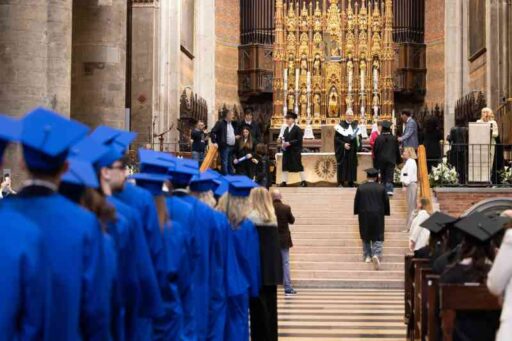 Dopo le testimonianze di tre laureati, uno per ogni Facoltà e tutti e tre già da mesi nel mercato del lavoro, è stato il momento della Cerimonia di consegna dei diplomi di laurea. Prima dell’aperitivo, l’iconico lancio dei tocchi ha aggiunto un «tocco» di colore alla facciata in marmo rosa e arenaria della Cattedrale. «L’Università Cattolica è nata come comunità dove si cresce insieme» ha concluso Mons. Ambrosio. «Per questo è tutta la Chiesa di Piacenza a essere in festa con voi». E tutta la comunità dell’Università Cattolica.