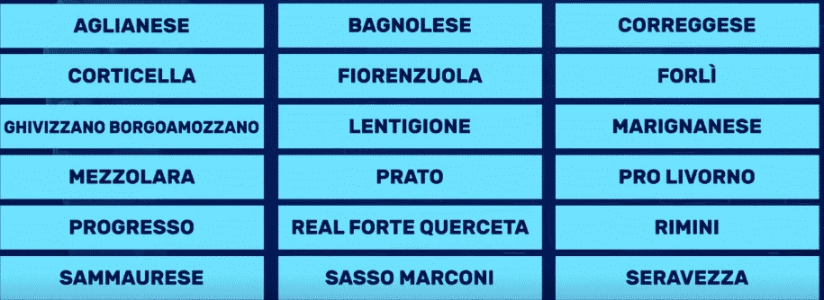 L’inserimento di formazioni come Pro Livorno, Seravezza, Prato, Querceta, Borgoamozzano, Aglianese, Corticella e Marignanese va in totale controtendenza rispetto all’anno passato. Mentre Rimini, Forlì, Mezzolara, Progresso, Correggese e Sasso Marconi segnano la continuità con le scorse stagioni.