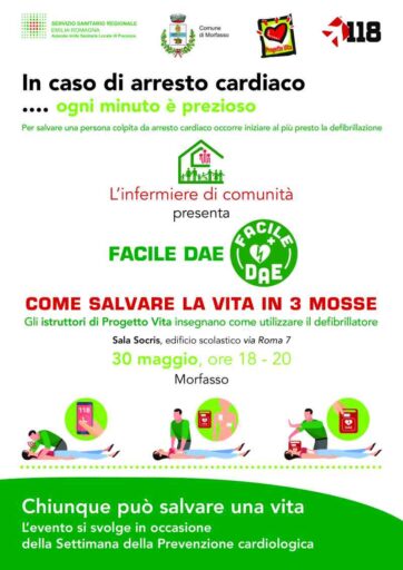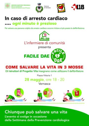 Com’è noto, in caso di arresto cardiaco, ogni minuto è prezioso. Per salvare una persona, occorre iniziare al più presto la defibrillazione. L’infermiere di comunità presenta quindi Facile Dae, appuntamento informativo per la cittadinanza. Gli istruttori di Progetto Vita insegnano come utilizzare il defibrillatore in caso di arresto cardiaco: