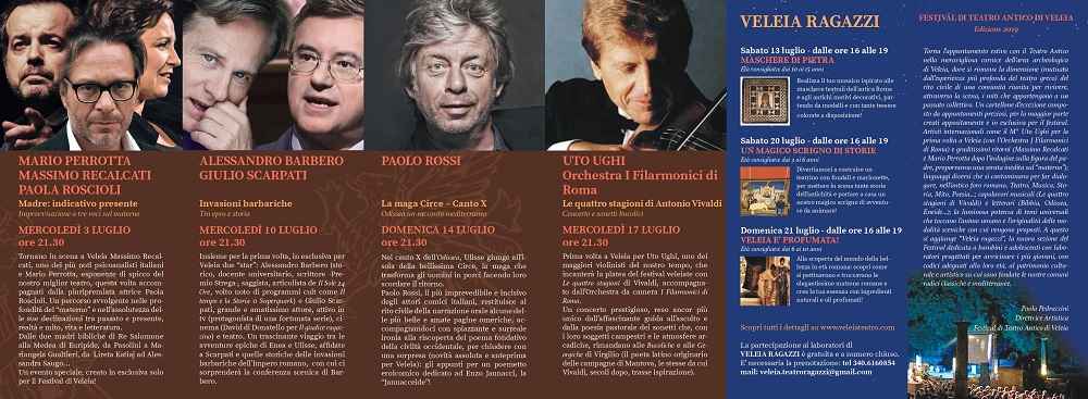 Artisti internazionali come il maestro Uto Ughi per la prima volta a Veleia (con l’Orchestra I Filarmonici di Roma) e graditissimi ritorni (Massimo Recalcati e Mario Perrotta dopo l’indagine sulla figura del padre, proporranno una serata inedita sul “materno”); linguaggi diversi che si contaminano per far dialogare, nell’antico foro romano, Teatro, Musica, Storia, Mito, ma anche Poesia…; capolavori musicali (Le quattro stagioni di Vivaldi) e letterari (Bibbia, Odissea, Eneide…); la luminosa potenza di temi universali che toccano l’animo umano e l’originalità delle modalità sceniche con cui vengono proposti.