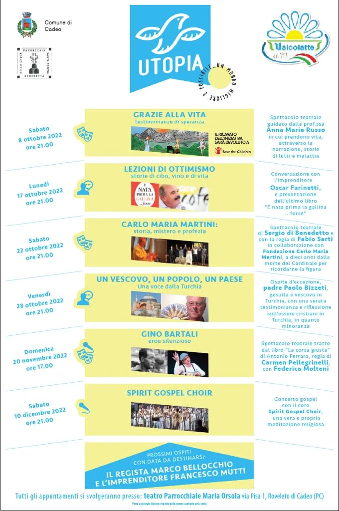 Riparte “Utopia”, il percorso che punta alla ricerca di personaggi che hanno fatto o fanno di questa società un luogo migliore, più giusto, sfidando il luogo comune che “utopia” sia un luogo irraggiungibile. Riparte lo spazio di dialogo e cultura che sfida i luoghi comuni, sul palco del teatro del Centro parrocchiale realizzato dalla parrocchia di Roveleto in collaborazione con il Comune di Cadeo.