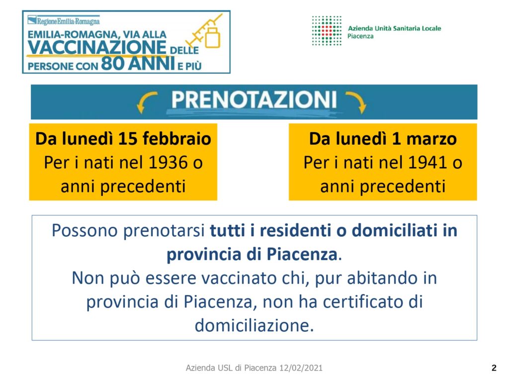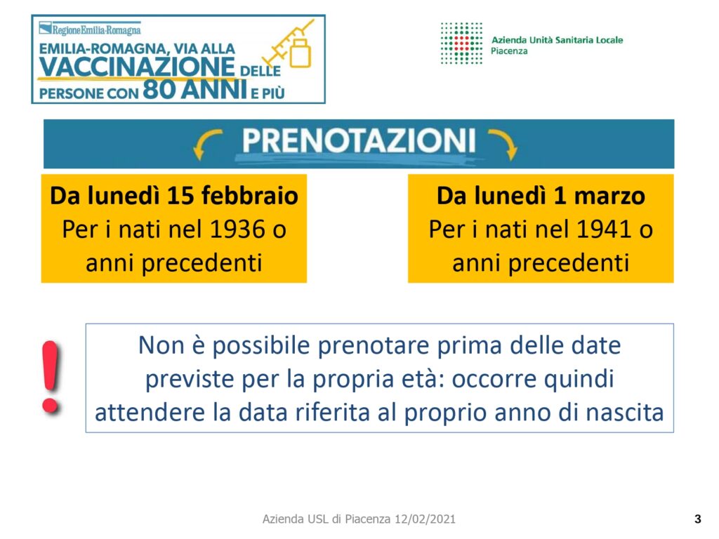 Coloro che sono nati nel 1936 o anni precedenti potranno prenotarsi da lunedì 15 febbraio. Dal primo marzo potranno prenotarsi anche coloro che sono nati nel 1941 o anni precedenti. Non è possibile prenotarsi se non si rientra in queste fasce.
