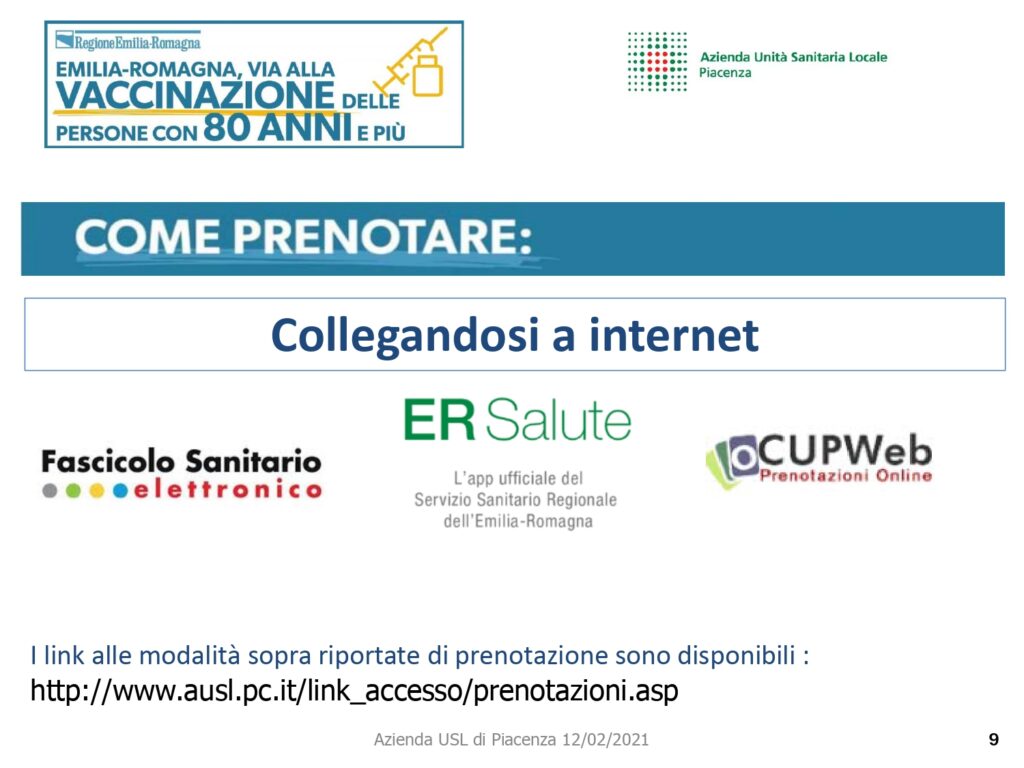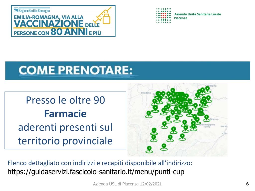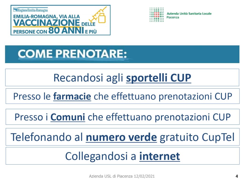 Cinque le possibilità per prenotarsi a Piacenza: sportelli CUP dell’azienda sanitaria locale (scelta sconsigliata dall’azienda sanitaria locale), farmacie abilitate alle prenotazioni CUP, comuni della provincia che effettuano le prenotazioni CUP (Agazzano, Caorso, Gropparello, Pontenure, Villanova e Gragnano), online: attraverso il Fascicolo Sanitario Elettronico, l’app ER Salute, CUPWeb.