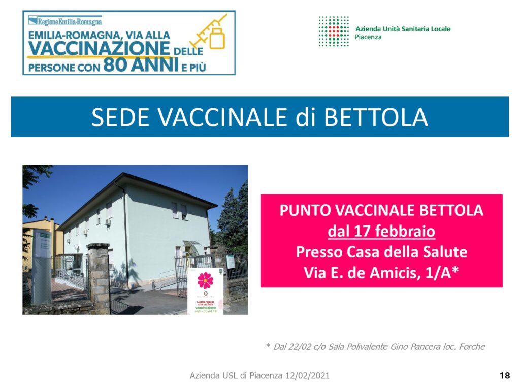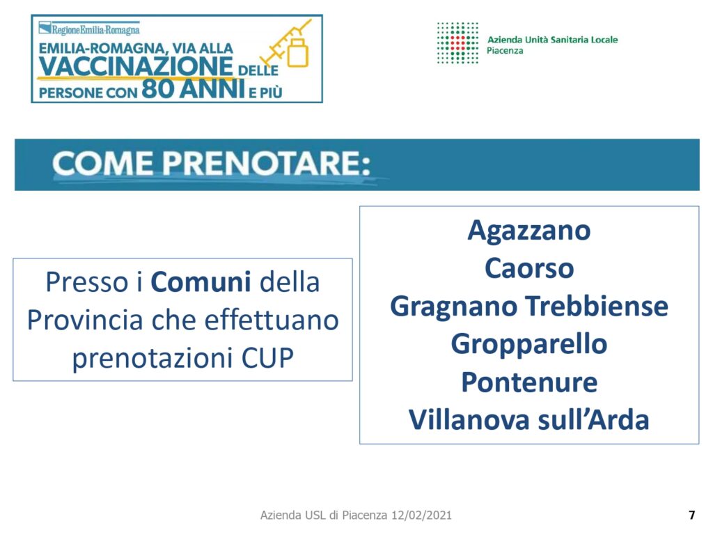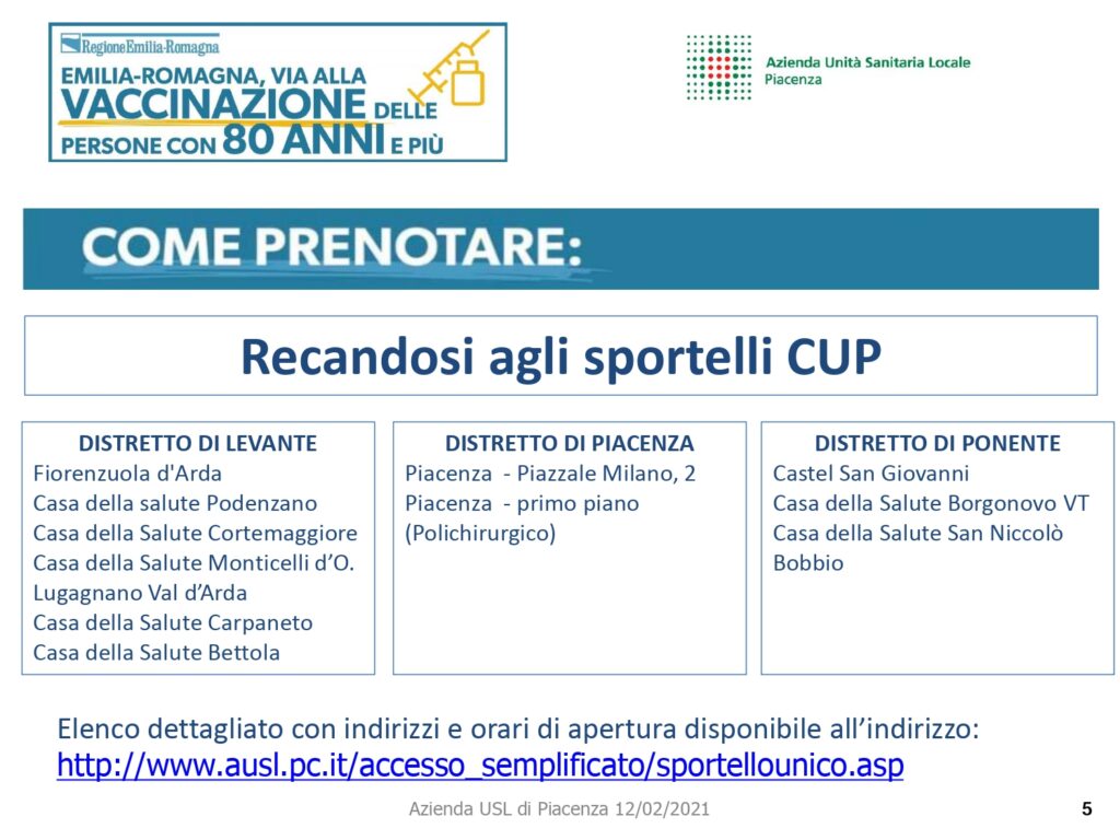 E’ possibile vaccinarsi in qualsiasi delle cinque sedi vaccinali allestite in provincia: Piacenza, Castel San Giovanni, Bobbio, Fiorenzuola, Bettola.