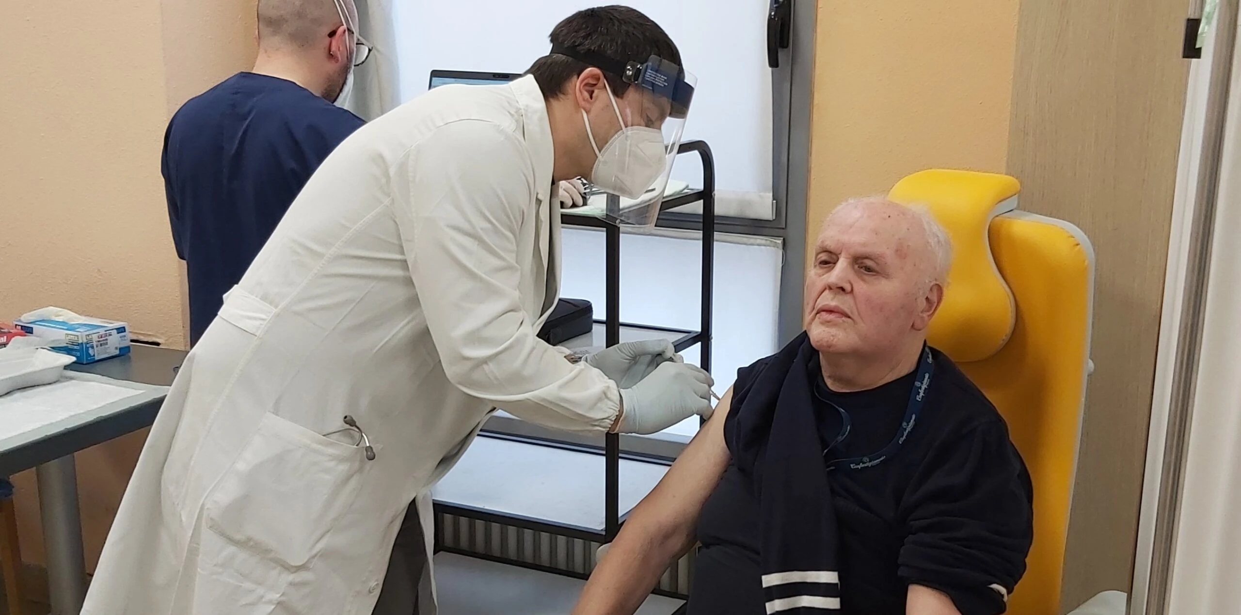 Nella foto, il signor Giancarlo Fiorani, 80 anni, al momento della vaccinazione. Qui è possibile scaricare anche le immagini video della vaccinazione