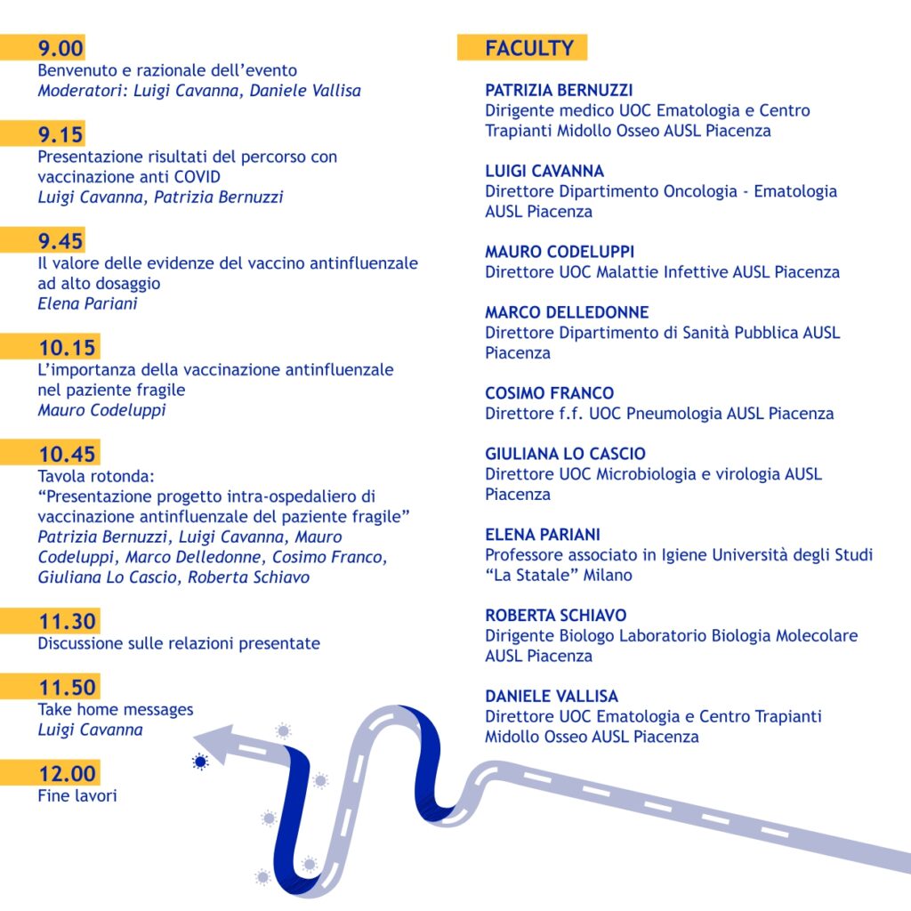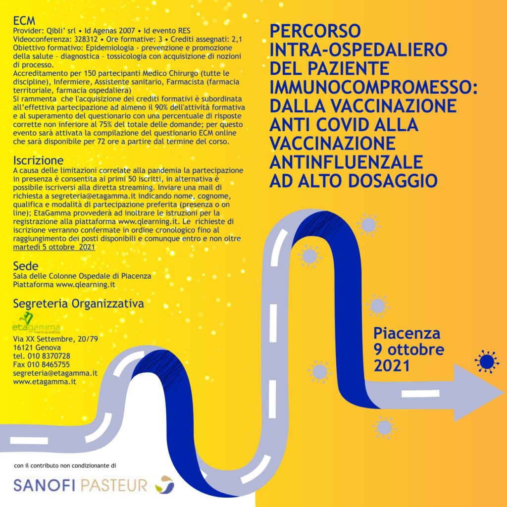 Sabato 9 ottobre 2021 presso la Sala delle Colonne dell’ospedale di Piacenza si terrà un’importante convegno sui vaccini anticovid ed antinfluenza per pazienti immunodepressi dal titolo: Percorso intra-ospedaliero del paziente immunocompromesso: dalla vaccinazione anticovid alla vaccinazione antinfluenzale ad alto dosaggio.