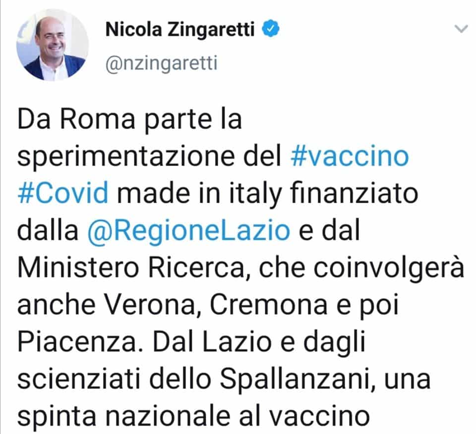 “Da Roma parte la sperimentazione del vaccino Covid made in italy finanziato dalla Regione Lazio e dal Ministero Ricerca; sperimentazione che coinvolgerà anche Verona, Cremona e poi Piacenza. Dal Lazio e dagli scienziati dello Spallanzani, una spinta nazionale al vaccino”.