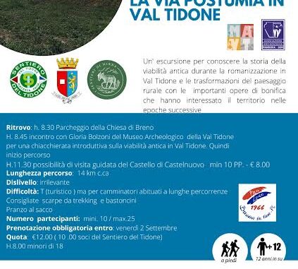 La quota di partecipazione è di € 12 per gli adulti, € 10 per i soci dell’associazione ‘Sentiero del Tidone APS’ e di € 8 per i minori di 18 anni: l’iscrizione obbligatoria deve pervenire entro venerdì 2 settembre e l’escursione si svolgerà con un numero limitato di partecipanti. Tutte le informazioni dettagliate si trovano sull’evento Facebook oppure contattando direttamente la guida escursionista ambientale AIGAE Mirna Filippi tramite i seguenti riferimenti: telefono 3923267010 (anche WhatsApp) oppure tramite email filippimirna@gmail.com .