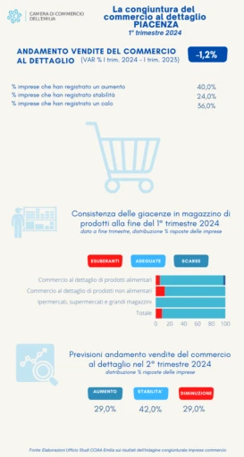 Commercio piacentino segnato da un calo dell’1,2%, rispetto allo stesso periodo del 2023, il bilancio delle vendite nel primo trimestre 2024.Un avvio d’anno, dunque, in salita, con esiti a maggior ragione deludenti se si considera che, a livello regionale, si è registrata una leggerissima tendenza (+0,1%) all’aumento.