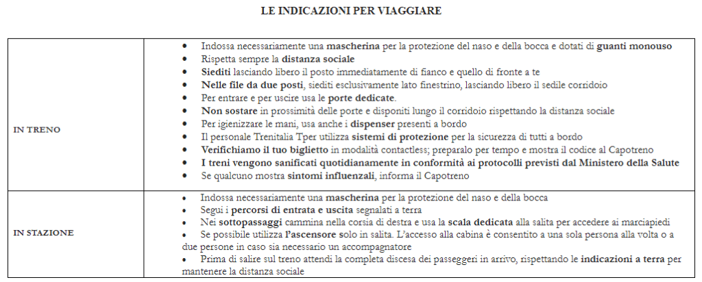 responsabili socialmente, per sé e per gli altri, rispettando la distanza di sicurezza indicata dalle autorità sanitarie, le indicazioni e le informazioni presenti a bordo dei treni e nelle stazioni
