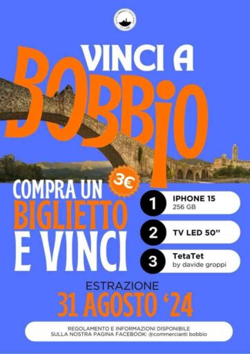 Vinci a Bobbio 2024, la festa inizia in piazza Duomo sabato 31 agosto dalle ore 16,30 con l’animazione e la musica di Radio Sound e tutti i negozi aperti per offrire ai visitatori una opportunità di shopping. Un’occasione per trascorrere una giornata all’insegna del divertimento e partecipare al concorso “Vinci a Bobbio” con la possibilità di vincere IPHONE 15 256 gB, TV Led 50″ o Teta Tet la lampada firmata Davide Groppi. Alle 19,45 l’estrazione della lotteria i cui biglietti saranno in vendita fino al tardo pomeriggio.