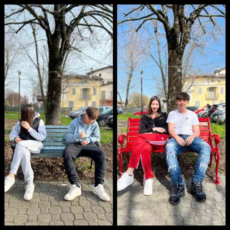 Perché le differenze e la diversità (soprattutto quella di genere) se non vengono accolte e comprese generano sempre e comunque forme di violenza. Nella seconda immagine Edoardo e Flora sono vicini e sorridono sulla panchina di prima che però ora brilla di un bel rosso “vivo”, in una serena giornata di sole. Perché con il percorso fatto insieme al centro antiviolenza di Piacenza hanno deciso di dire basta alla violenza contro le donne colorando di rosso e ridonando nuova vita alla panchina della scuola con le compagne e i compagni della loro classe.
