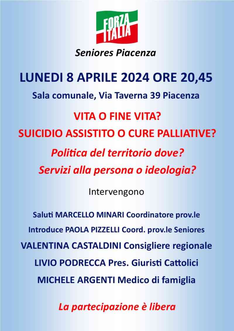 “Vita o fine vita?”. Questo è il titolo del convegno organizzato da Forza Italia lunedì 8 aprile alle 20,45 alla sala comunale di via Taverna 39, a Piacenza. Si parlerà di temi delicati come suicidio assistito e cure palliative nel tentativo di rispondere alla domanda: “Politica del territorio? Si ma dove?”.