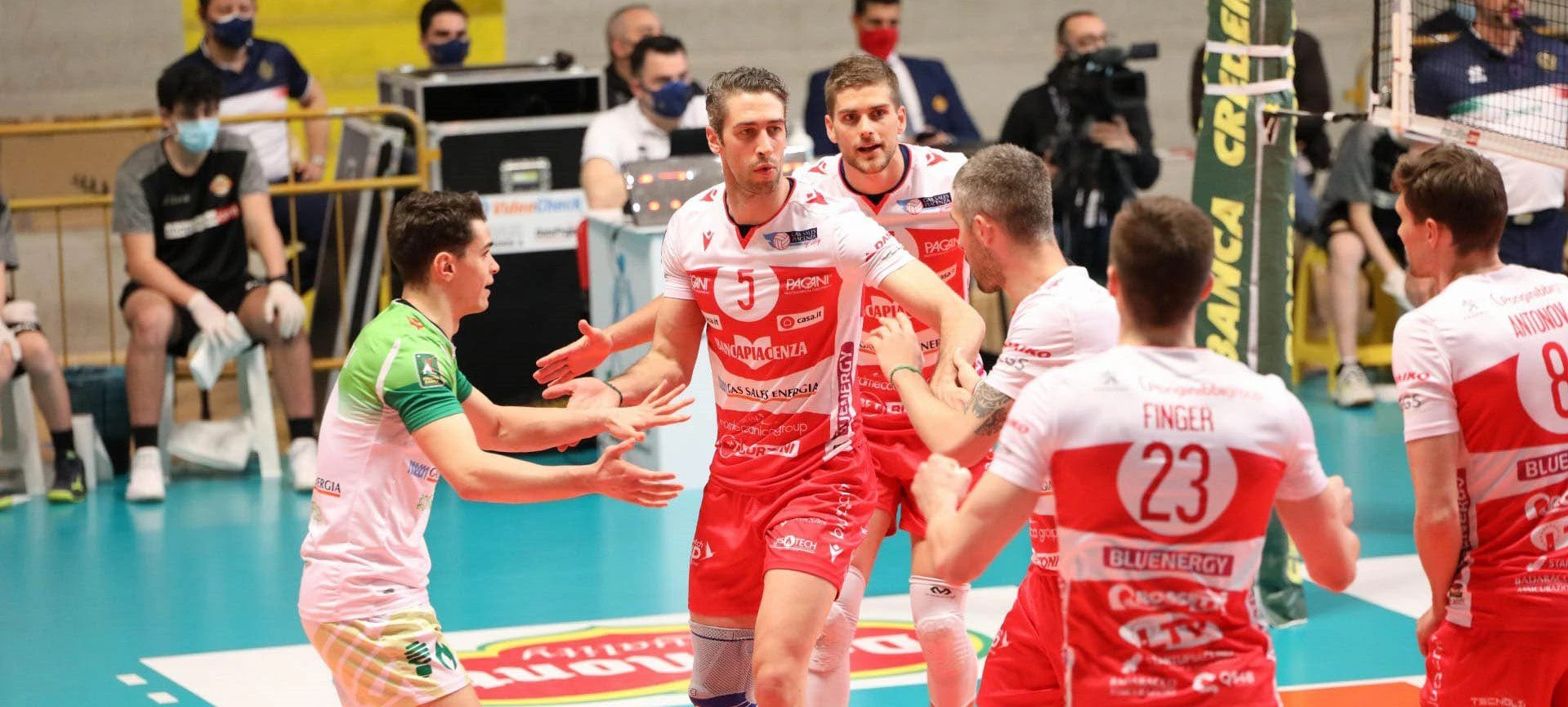 I piacentini vanno bene in tutti i fondamentali: il braccio caldo di Antonov fa male dalla linea dei 9 metri. Per lo schiacciatore sono ben 5 gli ace messi a terra; in attacco si fan trovare pronti capitan Clevenot (16 punti), miglior realizzatore dei suoi e Finger (13 punti e 60% in attacco). Sempre il francese è scatenato a muro con ben 4 block vincenti. Bene anche Candellaro che chiude con il 100% in attacco (6 punti in attacco).