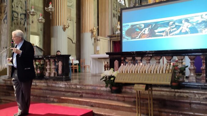 Il quadro all’attenzione della lectio era L’Angelo che appare alla moglie di Manuel, una tela ritenuta per tanto tempo di altro autore e formalmente convalidata di Guercino dallo stesso critico d’arte, a conferma di scritti dell’artista di Cento con i Fabbriceri che non si conclusero però con un accordo scritto, rimanendo così di lettura equivoca. Nel 1623, un secolo dopo la conclusione del cantiere architettonico, la Fabbriceria commissionò una serie di opere ad artisti lombardi ed emiliani, per adornare il fregio. Il programma iconografico, che sarà concluso alla fine del XVIII secolo, affrontò una serie di storie bibliche scelte in relazione ai riferimenti mariani. E nell’archivio del santuario si è rinvenuta la risposta del Guercino, datata 12 agosto 1636, alla richiesta avanzata dai Fabbricieri di “fare un lavoro per questa chiesa”.