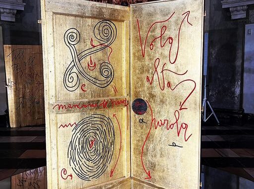 “La Mostra che ho qui in questo piccolo museo, che indipendentemente dalla mostra è da visitare, si trova in una chiesa costruita su progetto del Bibbiena, si tratta di una mostra fatta di porte d’oro su cui sono trascritti, con la mia cifra stilistica, i versi di alcuni dei poeti più grandi al mondo che mi sono stati inviati dagli stessi autori”.