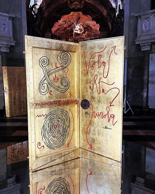 “La Mostra che ho qui in questo piccolo museo, che indipendentemente dalla mostra è da visitare, si trova in una chiesa costruita su progetto del Bibbiena, si tratta di una mostra fatta di porte d’oro su cui sono trascritti, con la mia cifra stilistica, i versi di alcuni dei poeti più grandi al mondo che mi sono stati inviati dagli stessi autori”.