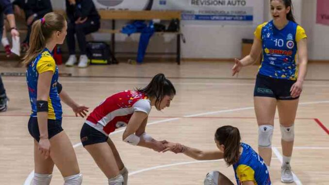 Una spettacolare rimonta non basta alla Rossetti Market Conad per mettere il punto esclamativo nell’ultimo impegno stagionale casalingo in B2 femminile contro la Zerosystem. Contro un avversario già certo dei play off ma ancora in corsa per il primo posto, la squadra di Paolo Bergamaschi (terza alla vigilia e matematicamente fuori dai giochi promozione) ha ceduto al tie break. Sotto 2-0 e 22-19, Alseno ha trovato le forze per reagire, rimontando fino al 2-2, ma nel quinto set ha ceduto al ritorno di fiamma delle modenesi. Il rammarico gialloblù risiede soprattutto nel primo set, dove Falotico e compagne erano avanti 13-4 cedendo poi 22-25.