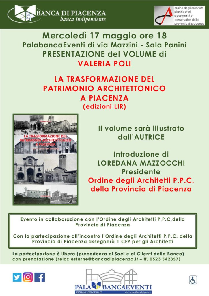 Mercoledì 17 maggio, alle 18, al PalabancaEventi di via Mazzini, in Sala Panini, appuntamento, per iniziativa della Banca di Piacenza in collaborazione con l’Ordine degli architetti della provincia di Piacenza (per gli iscritti all’Ordine, l’incontro vale 1 credito per la formazione professionale), con la presentazione del volume di Valeria Poli “La trasformazione del patrimonio architettonico a Piacenza” (Edizioni LIR).