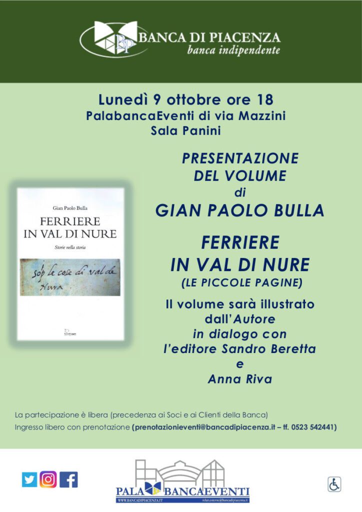 Lunedì 9 ottobre, alle 18, al PalabancaEventi (Sala Panini) presentazione del volume di Gian Paolo Bulla (ex direttore dell’Archivio di Stato) “Ferriere in Val di Nure – Storie nella storia” (Ed. Le Piccole pagine). Un appuntamento organizzato dalla Banca di Piacenza. Il libro sarà illustrato dall’autore in dialogo con l’editore Sandro Beretta e con Anna Riva, attuale direttrice dell’Archivio di Stato di Piacenza.