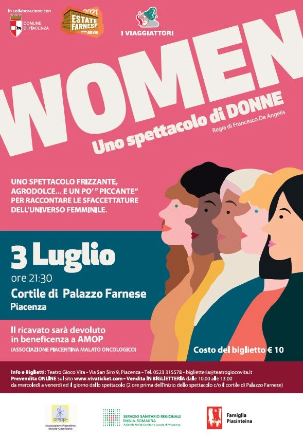 Women, uno spettacolo di donne, nel cortile di Palazzo Farnese il 3 luglio alle 21 30. Lo spettacolo proposta da ” I Viaggiatori” è divertente, agrodolce e un po’ piccante. In particolare racconterà le tante sfaccettature dell’universo femminile.
