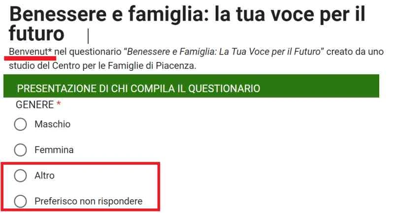 Zanardi, a seguito di alcune segnalazioni che le sono pervenute, rileva: “Accedendo al questionario attraverso il QR Code o il relativo link si notano da subito alcuni elementi: la premessa utilizza un linguaggio cosiddetto “inclusivo del genere”: “Benvenut*”; il primo passaggio da completare è riferito al GENERE in cui tra le opzioni si legge: maschio, femmina, altro, preferisco non rispondere”.